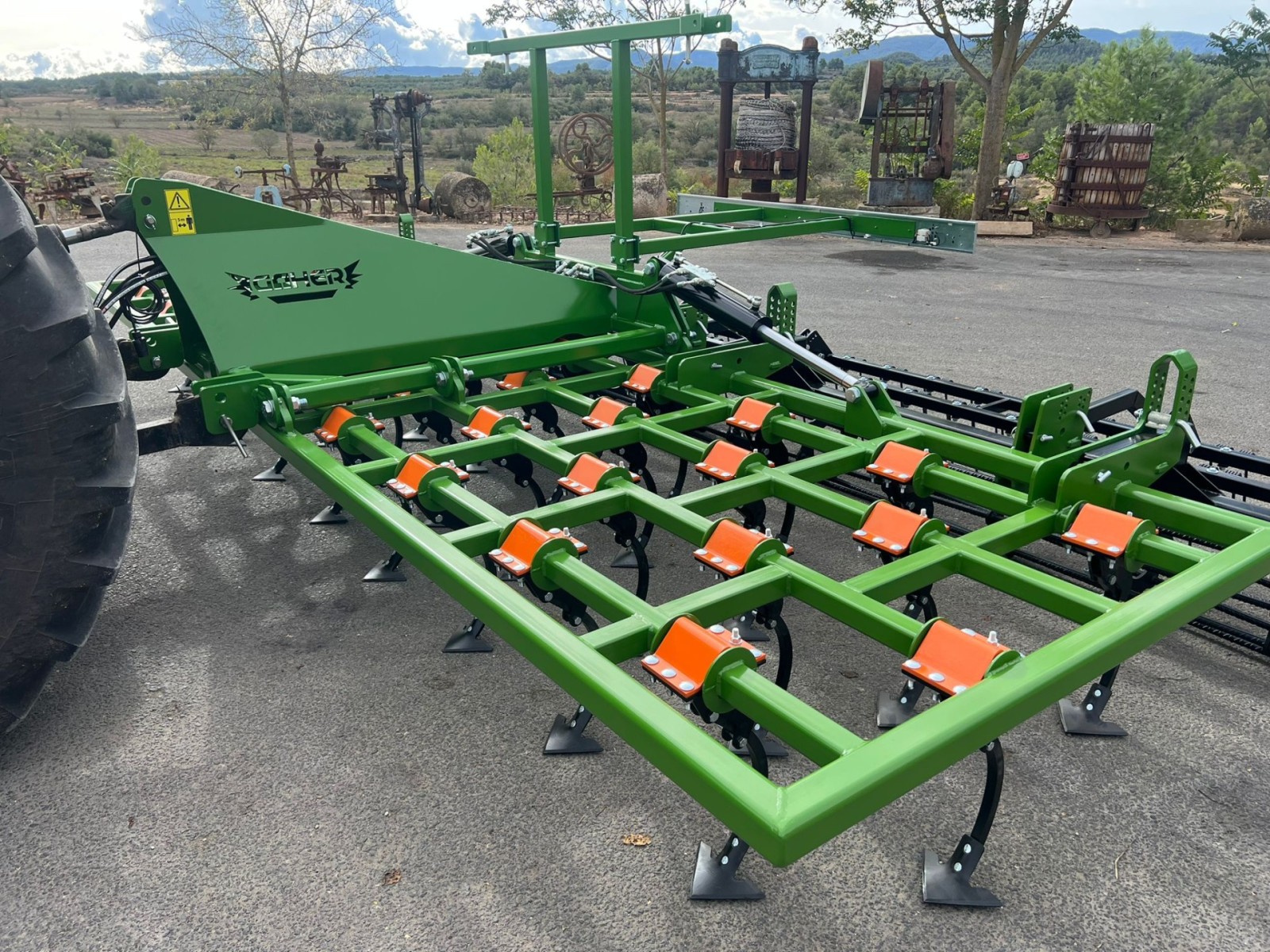 - Chasis fabricado con perfiles estructurales de 80x80x6 y 60x60x6, unido con la torreta central fabricada de una sola pieza, en chapa de 10mm, des del punto de enganche de los brazos, hasta el punto de enganche del tercer punto, uniendo todos los tubos estructurales de la máquina.